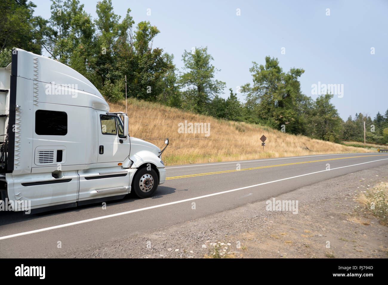 Big Rig White Semi Truck With Dry Van Full Size Semi Trailer With Aerodynamic Cab Elements Driving Uphill On The Winding Highway Road With Forest And Stock Photo Alamy